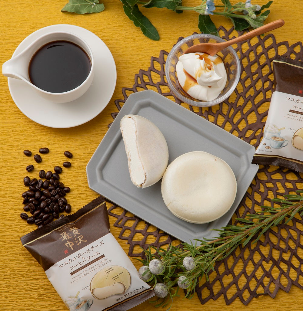 マスカルポーネチーズの濃厚なアイスにほろ苦いコーヒーソースを加えてモナカにサンド。濃厚でコクのあるマスカルポーネチーズはほんのり甘く、ミルキーな味わいです。