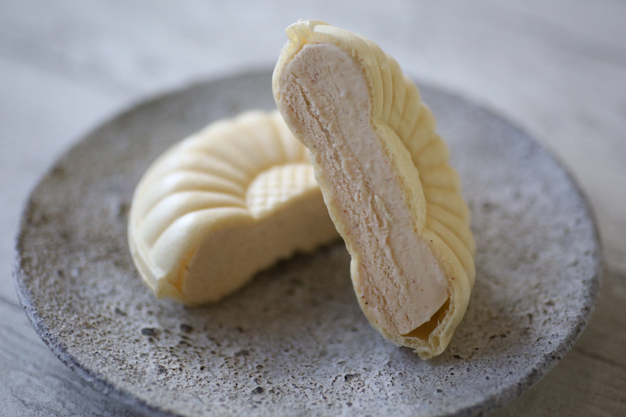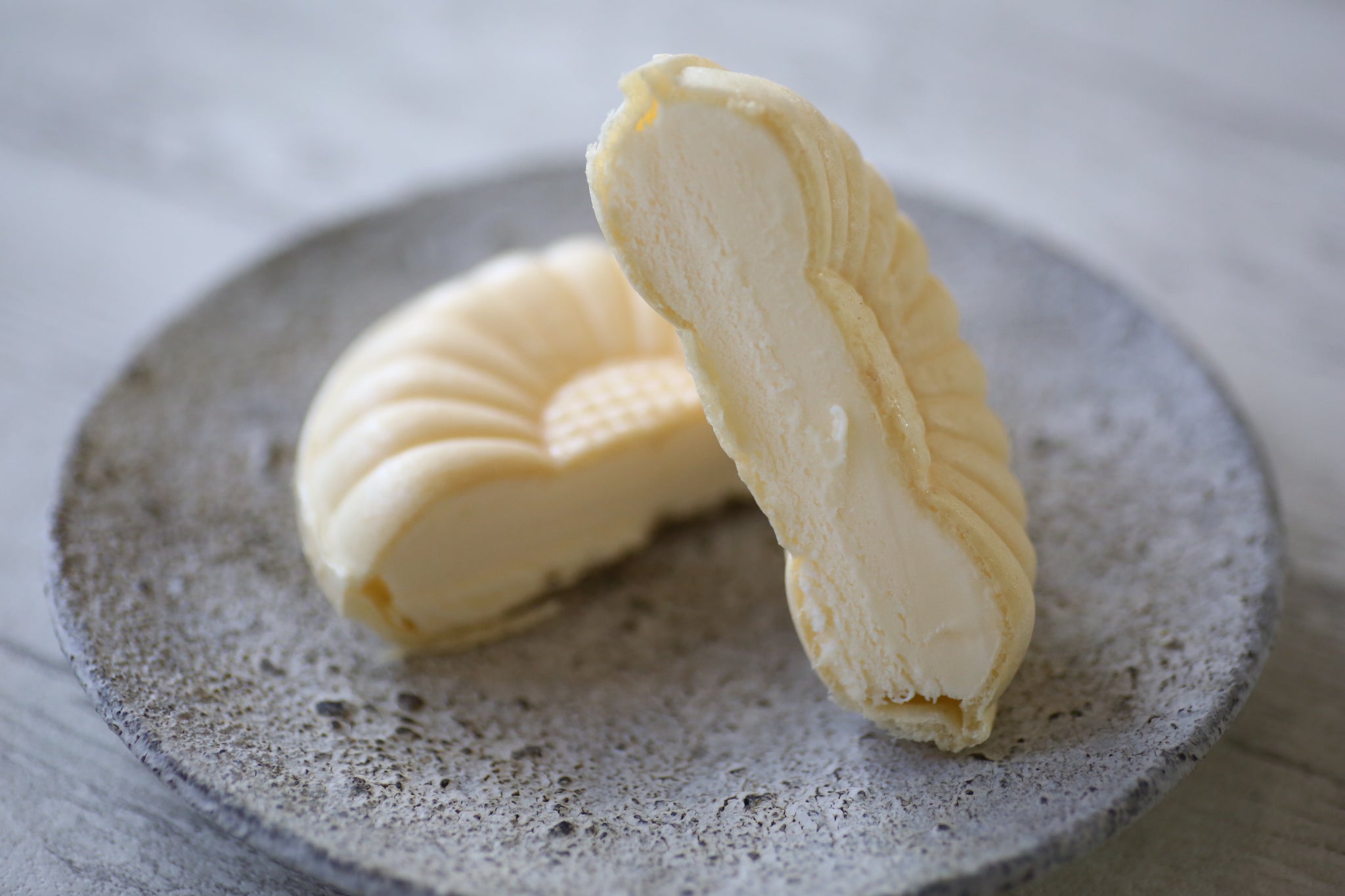 高知県内の酪農家が育てた生乳から作られた牛乳のみ使用。高知県の田野屋塩二郎「完全天日塩」を100%使用し、海洋深層水を入れる事で深みやコクをさらに引き出しています。もなか種は無着色もなかを使用。