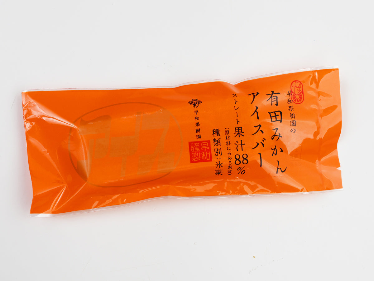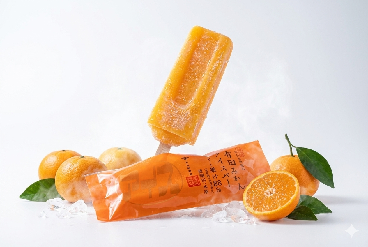 和歌山県・有田地方で育ったみかんの果汁を88%も贅沢に使用した、濃厚フルーツアイスバー。ひと口かじると、まるで完熟みかんをそのまま凍らせたかのような、みずみずしい果汁感と自然な甘さが口いっぱいに広がります。原料の美味しさを最大限に引き出すため、余計なものは加えず、寒天とこんにゃく粉という自然素材でやさしく固めました。